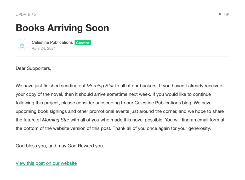We have just finished sending out Morning Star to all of our backers. If you haven’t already received your copy of the novel, then it should arrive sometime next week. If you would like to continue following this project, please consider subscribing to our Celestine Publications blog. We have upcoming book signings and other promotional events just around the corner, and we hope to share the future of Morning Star with all of you who made this novel possible. You will find an email form at the bottom of this post. Thank all of you once again for your generosity.
